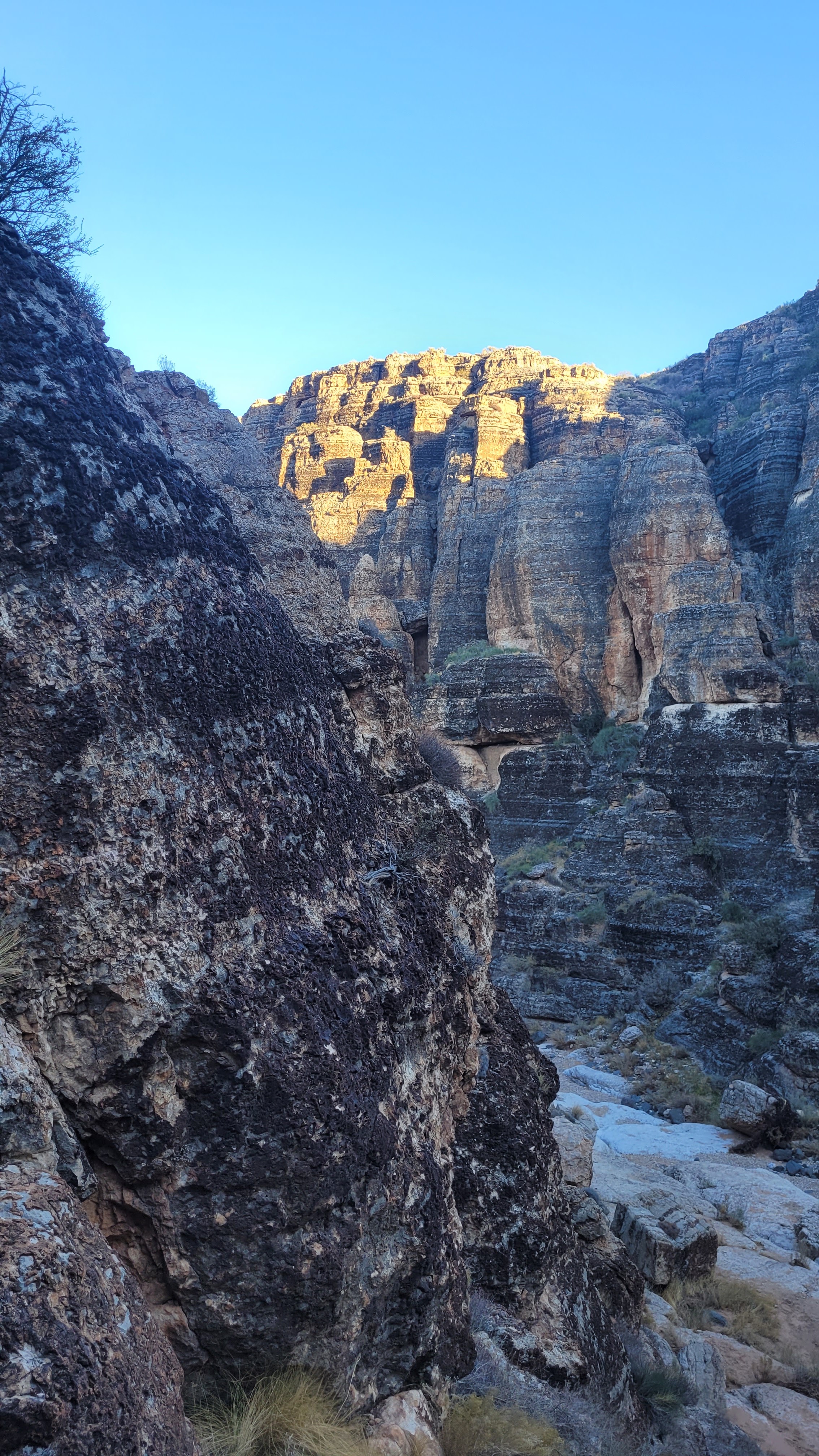 At the end of the slot canyon is a wall that requires a small climb with the aid of a knotted handline. Once at the top, we inspected the bolts, and everything appeared to be safe and secure.