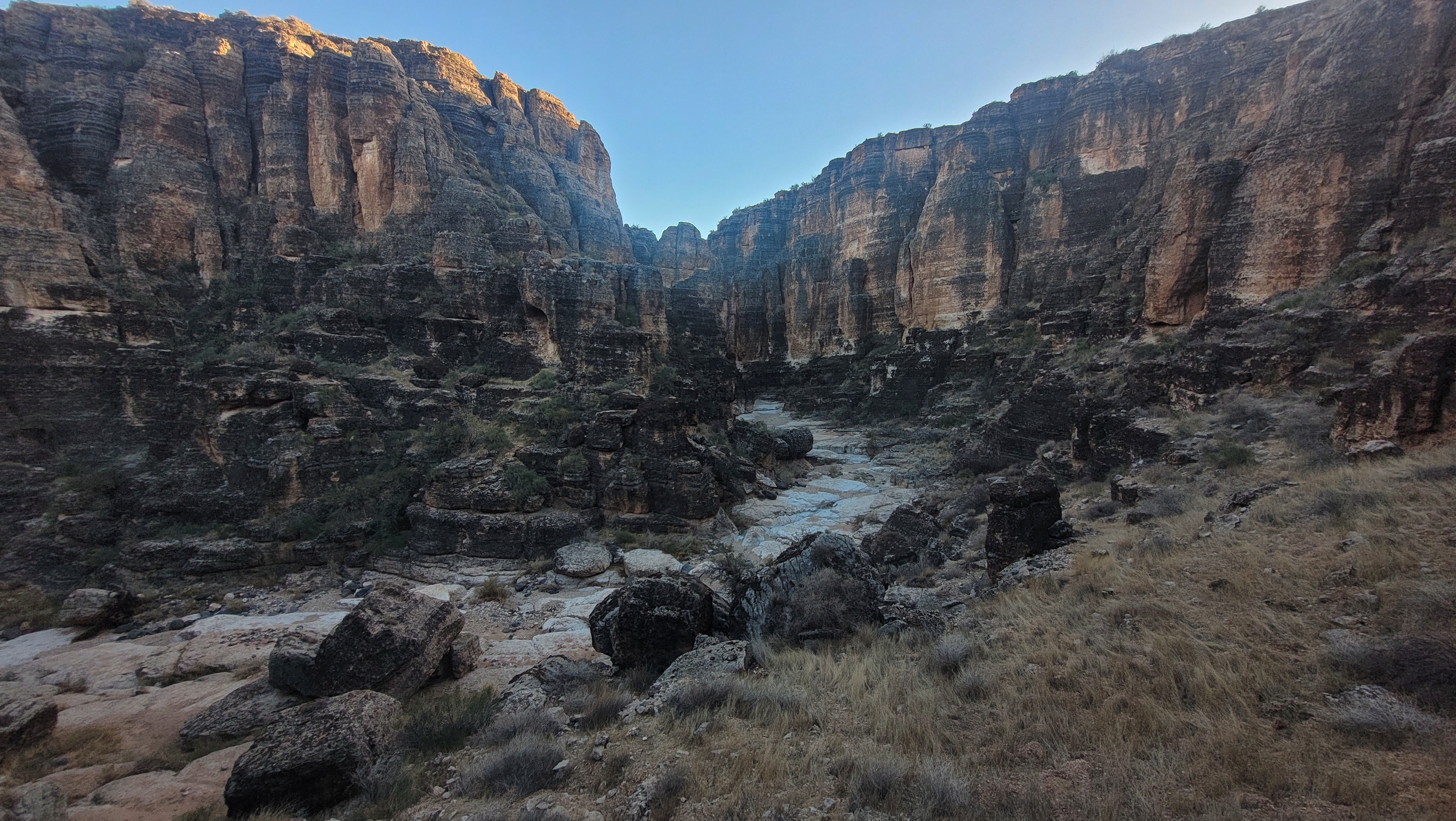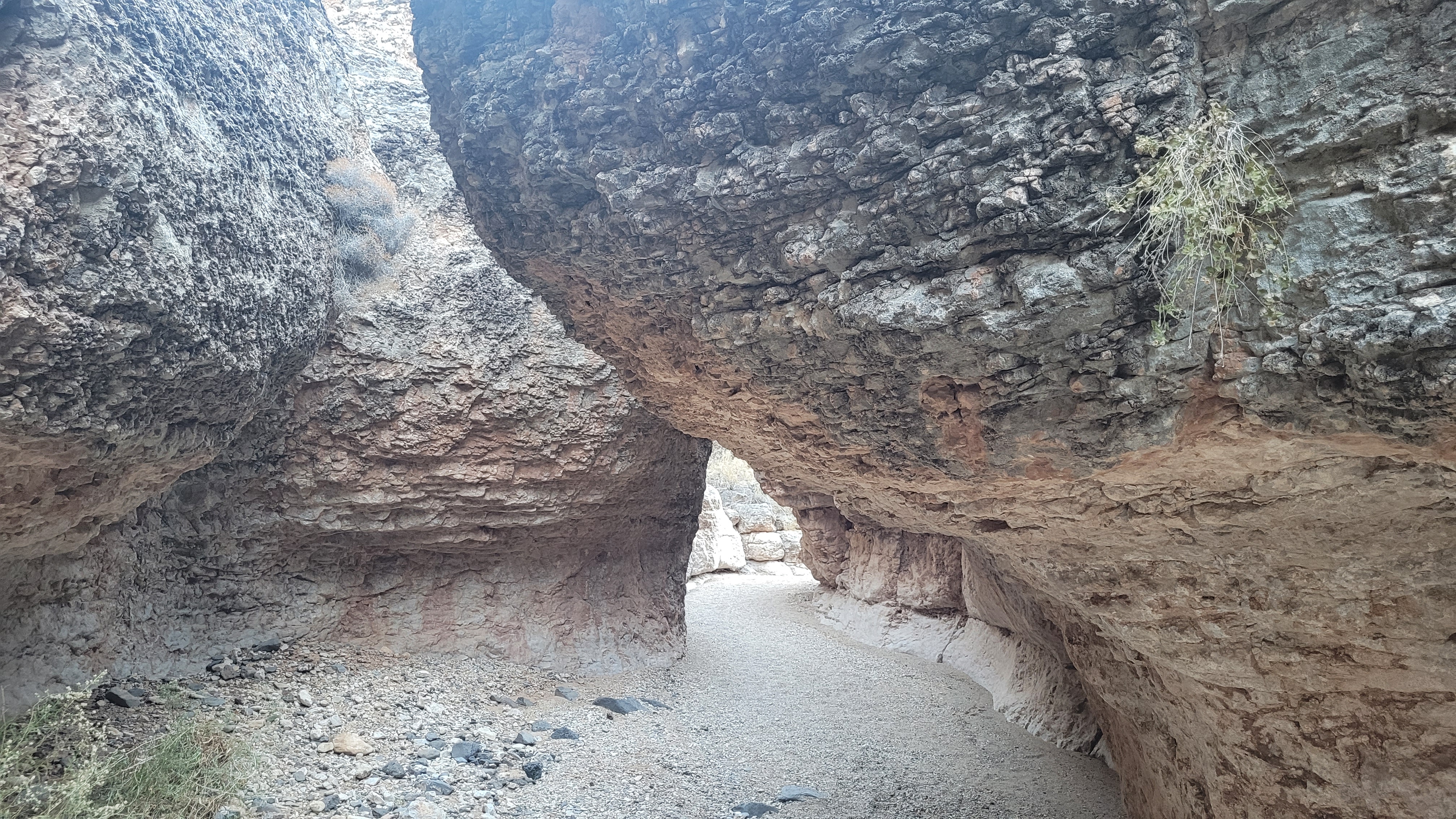 The floor of the canyon is a mixture of limestone slabs; soft, silty sands; and massive boulders. Towering walls on both sides offer a noticeable contrast to the blue sky skies overhead. The canyon is full of twists and turns. It’s obvious that powerful streams of water have undercut several sections of the wall on both sides. And if you visit Fossil Canyon after a rainstorm, you’re sure to potholes full of water – water teeming with all sorts of living things!