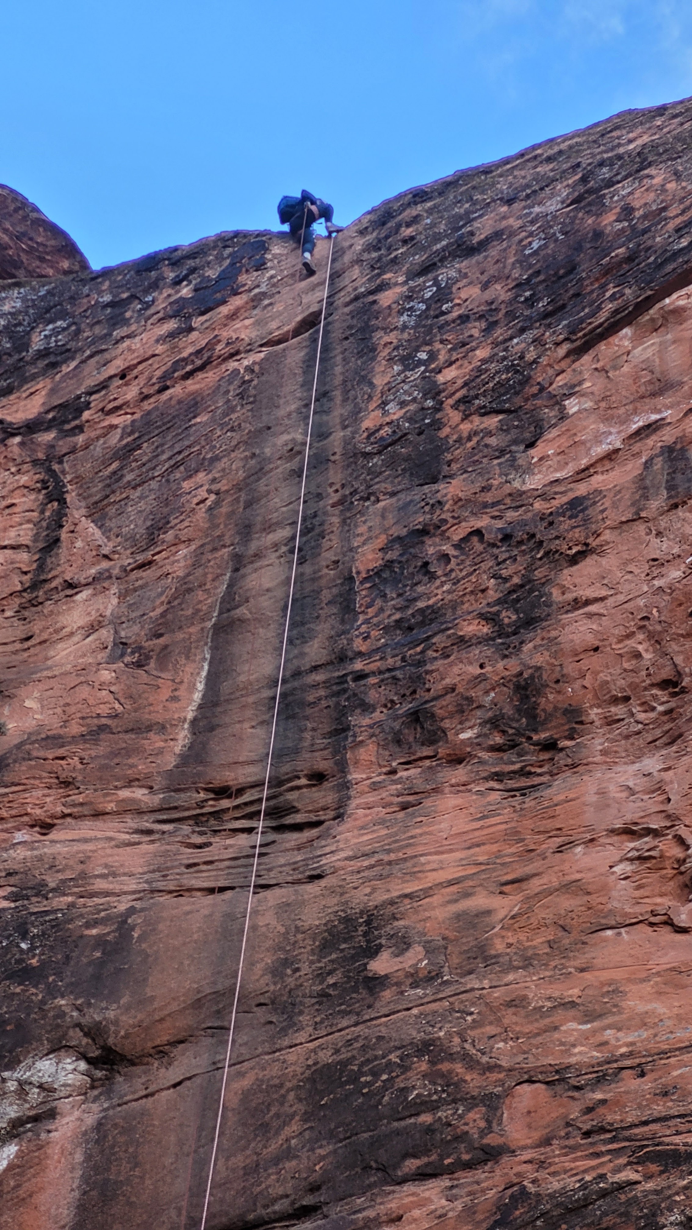 Once on top, head in a northerly direction, keeping Snow Canyon to your right. You’ll eventually hit Pictograph Canyon where you’ll veer slightly left so it remains on your right. The first rappel is in the direction of the black rocks and seemingly about halfway down the Tuacahn Chimney. You’ll see it as you carefully make your way down a somewhat narrow shelf.