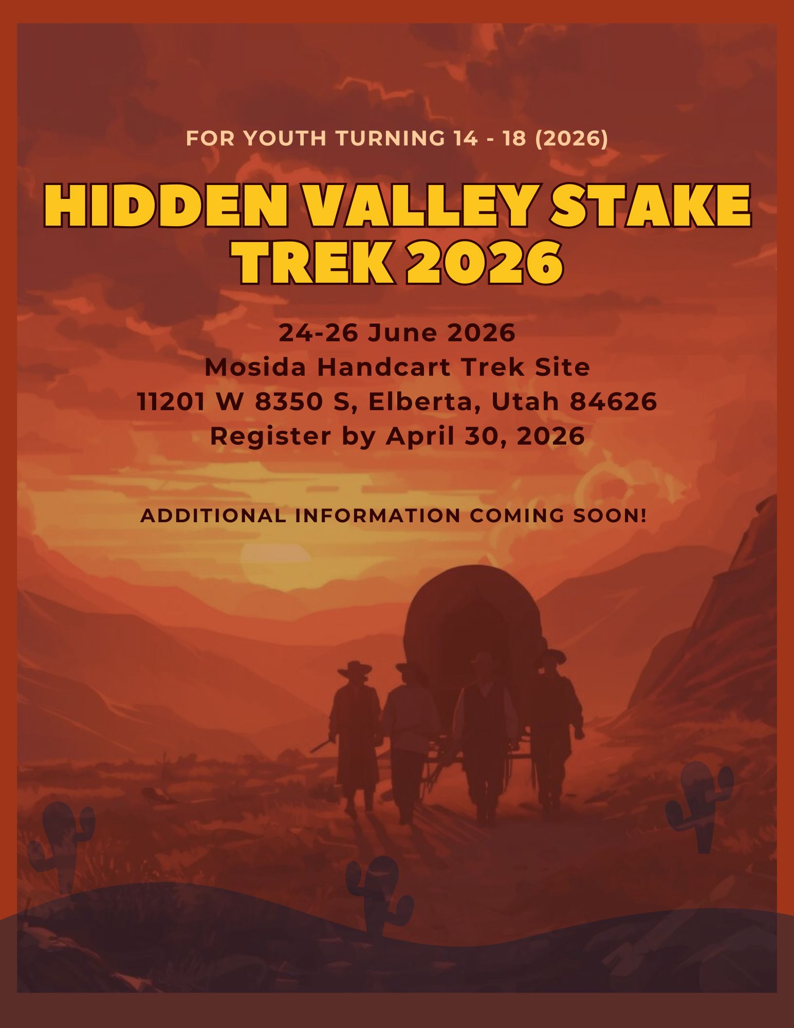 We’re excited you’ll be part of the Hidden Valley Stake Youth Trek! Trek is a special activity where youth and leaders work together, walk together, and learn together—similar to what the pioneers did on their journey across the plains in the mid-1800’s.. Youth trek is meant to help you build faith, confidence, friendships, and appreciation for those who came before us.